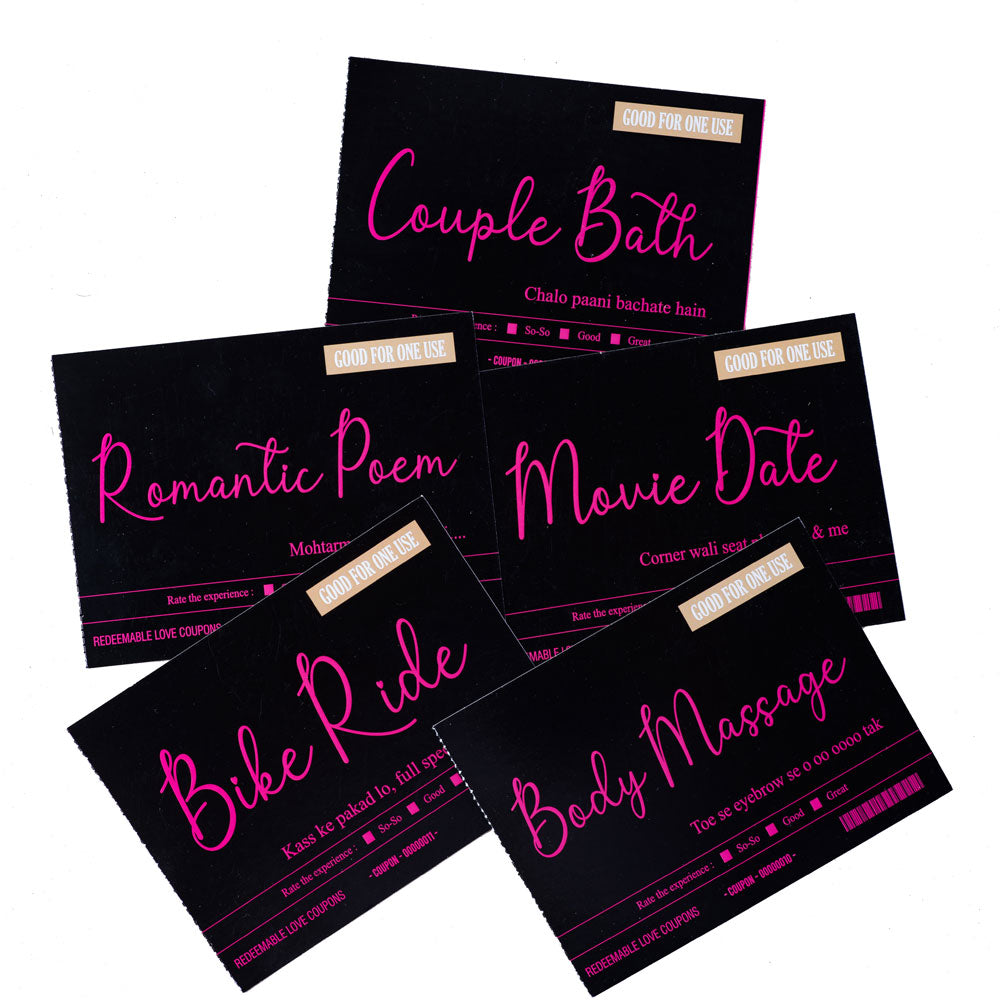 Love Coupons or Pyaar Wale Coupons as they are known, are a perfect gift for the anyone who will get entitled to many redeemable coupons. Coupons can be redeemed whenever they want to get different romantic and fun activities.