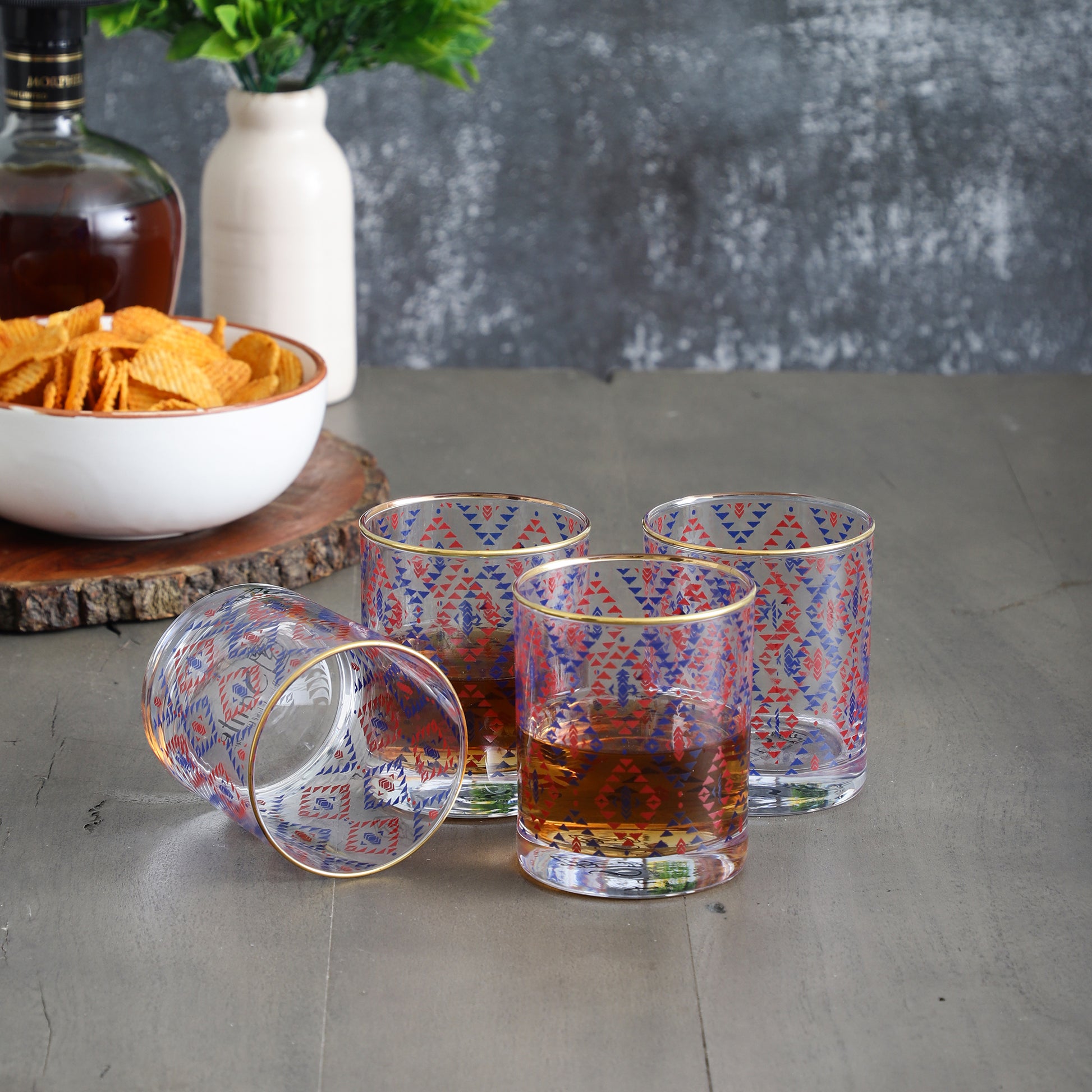 Enhance your glassware collection with the Ikkat Luxury Drinking Glasses Set. Crafted for those who appreciate fine design and function, this set of four 300 ml glasses features an elegant golden line and intricate pattern – perfect for adding a refined touch to any bar, dinner table, or party setup.